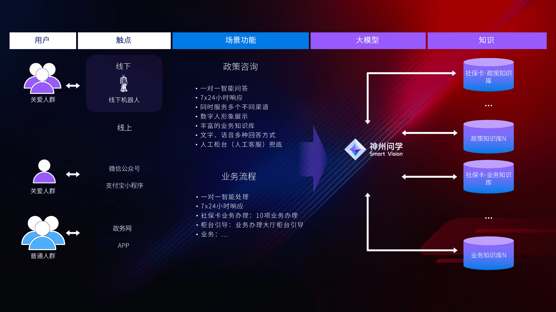 • 线上线下全覆盖:线上提供微信公众号、、、、支付宝小程序、、政务网、、app多种渠道,,,,与线下机器人形成完整服务体系。。。