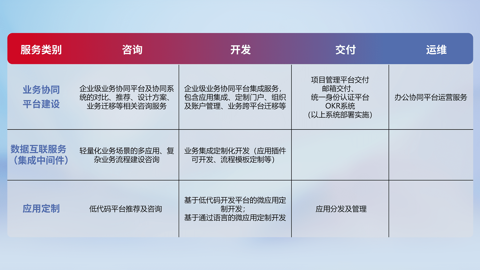 针对钉钉、、企微、、IDaas等平台级产品提供产品的规划、、、、方案、、交付、、定制化开发等服务,,实现如统一协同办公、、智能客户服务、、混合会议管理、、、、智能数据查询、、、、等业务场景,,实现数字化转型。。。